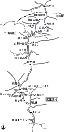 この蔵王連峰と、その北に連なる二口山塊を継続して縦走することが、朋友会の会員によって行なわれている。蔵王連峰と二口山塊の境界は明確でないが、笹谷峠とするのが一般的のようだ。